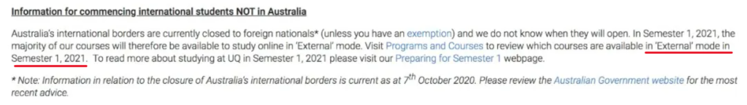 UQ已通告2021年第1学期的授课模式将维持远程授课,在注册课程时可选“External”或 ”Flexible”,对于在澳洲境外无法回澳学习的可以选择“External”。