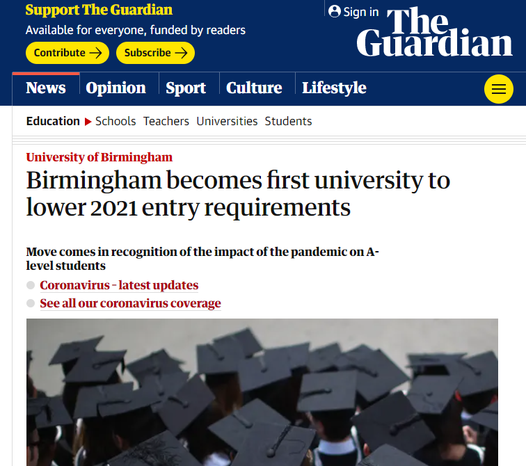 伯明翰大学宣布降低2021年大部分本科课程的A-level入学要求,即降低一个等级。