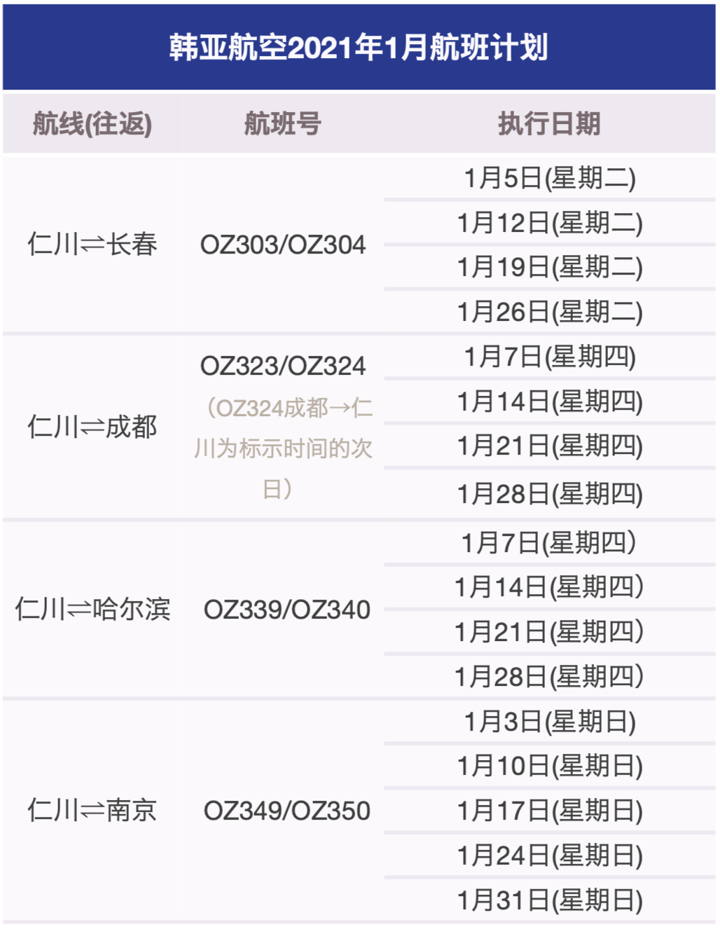韩亚航空在2021年1月执飞“仁川-长春”、“仁川-成都”、“仁川-哈尔滨”、“仁川-南京”航线。