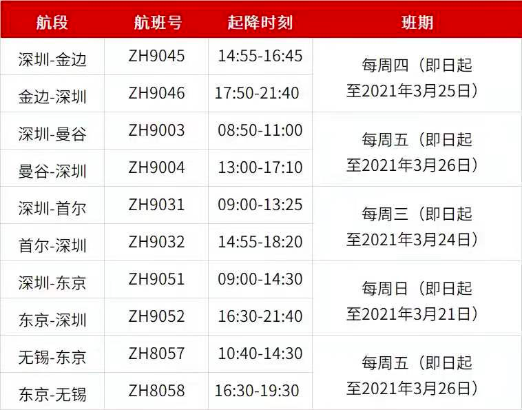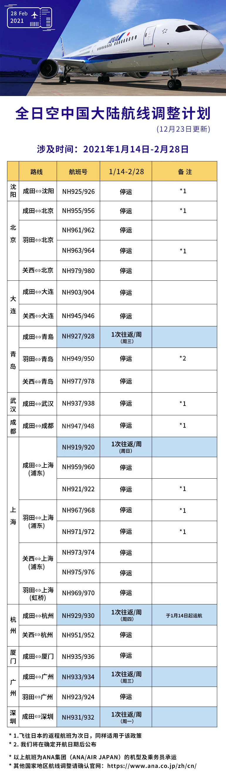 全日空航空在2021年1月14日-2月28日,将执飞“成田-青岛”、“成田-上海(浦东)”、“成田-杭州”、“成田-广州”、“成田-深圳”的航线,每周往返一次。