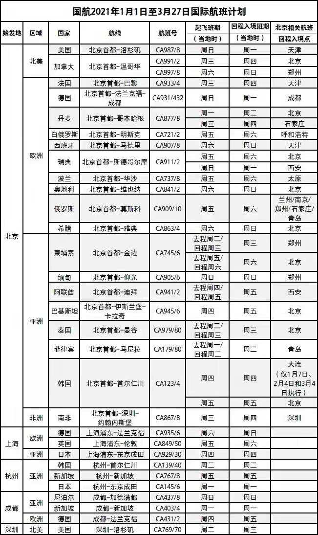 中国国航在2021年1月1日-3月27日期间,每周执飞30条国际航线,这30条国际航线涉及: