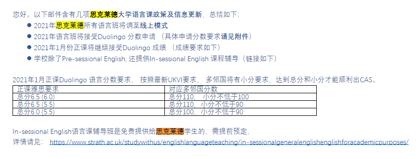 思克莱德大学2021年语言课接受DET多邻国英语测试成绩,语言课为线上模式。1月份的正课接受DET多邻国英语测试成绩。