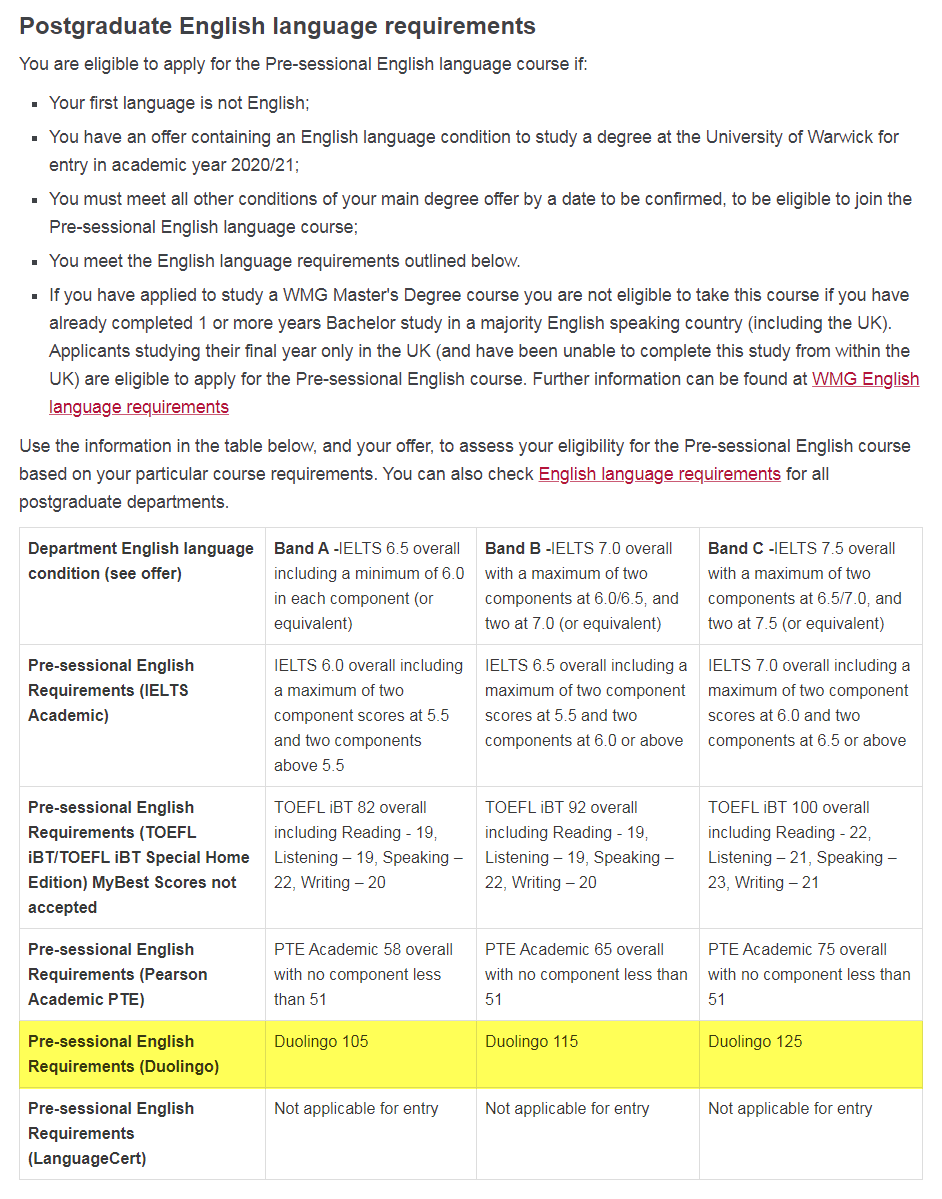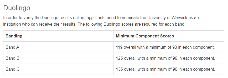 华威大学2021年入学正课及语言课接受DET多邻国英语测试成绩,有小分要求。