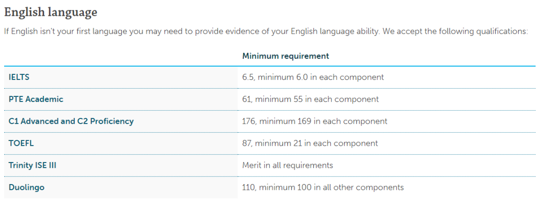 不同专业的语言成绩要求不一样,一般来说多邻国总分不低于110,小分不低于100,更多可查看约克大学官网。