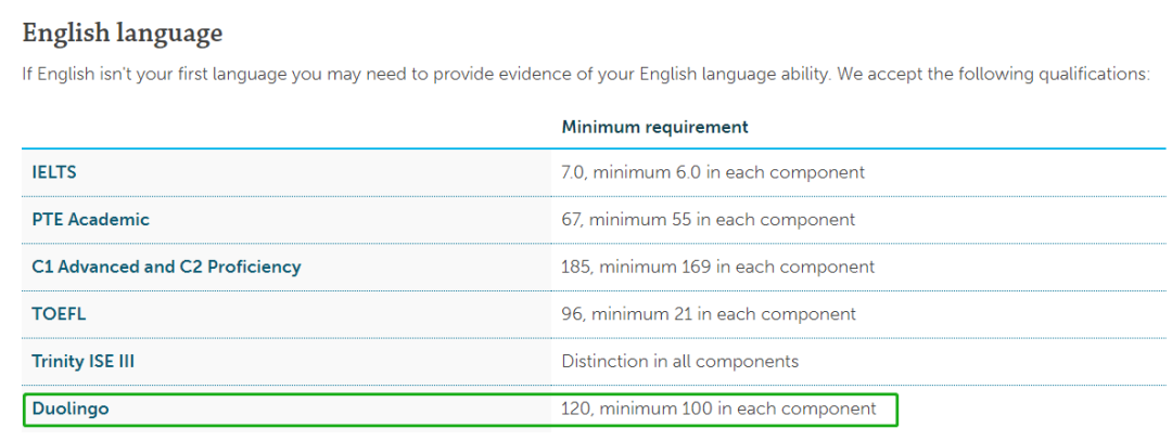 利莫瑞克大学2021年Fall入学正课接受多邻国英语测试成绩,具体语言要求如下: