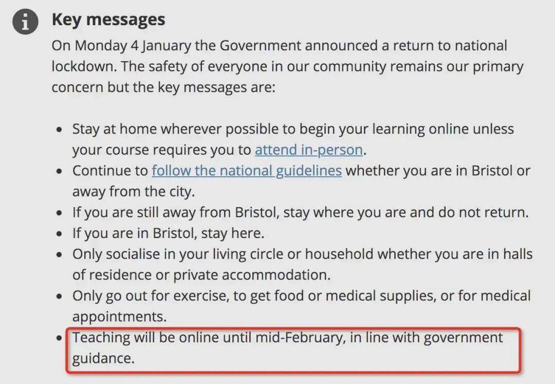 布里斯托大学表示,2月中旬之前都进行线上教学。