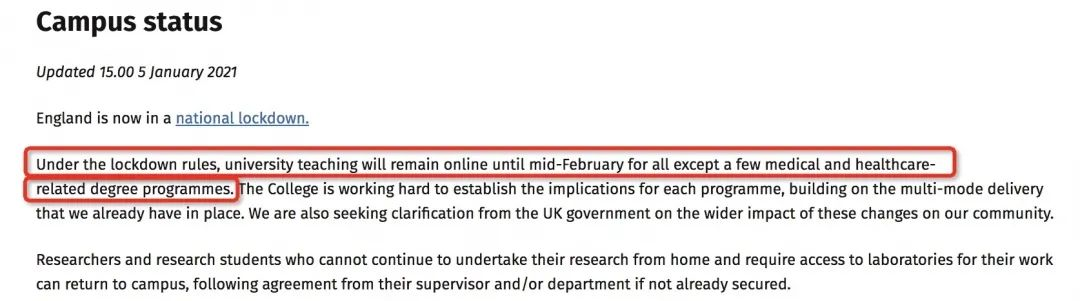跟牛津大学一样,如果是需要进行研究项目的PGR学生,或是已在前往英国行程中,特殊情况无法更改,允许返校,但需要提前和院系沟通,确认情况。
