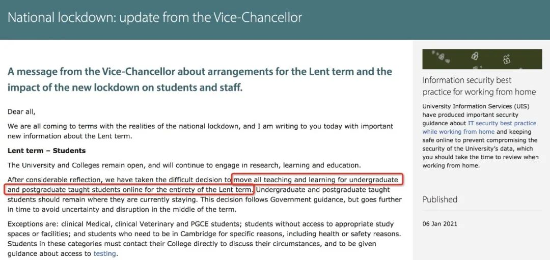 牛津大学要求大多数学生在2月中旬之前不要返校,只有特殊课程的学生可以回来学校,比如医学专业的学生,校方会直接跟学生联系。