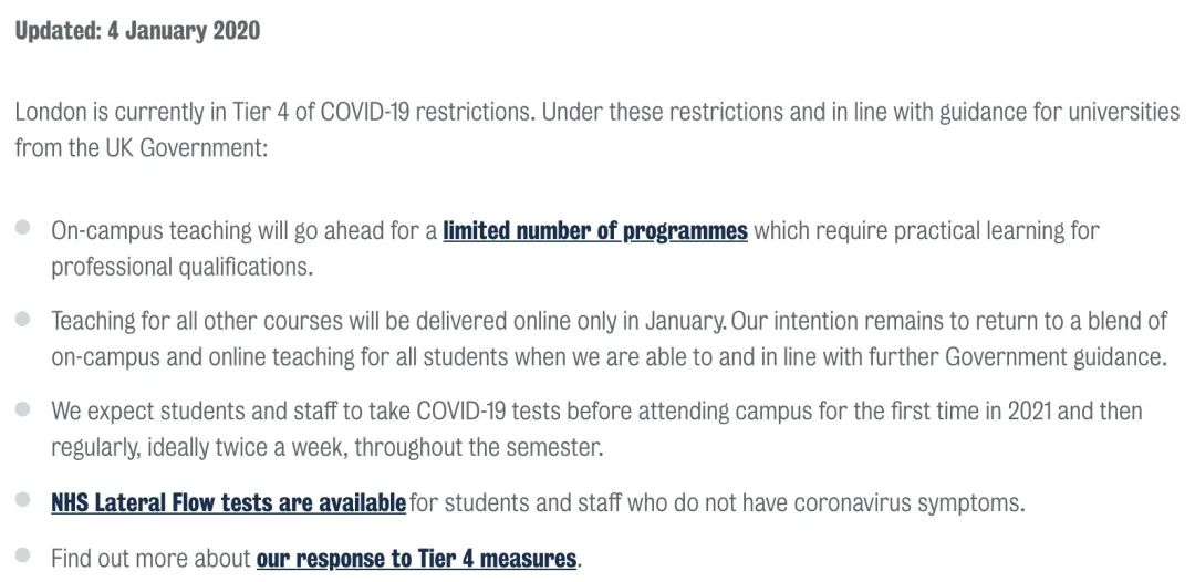 伦敦国王学院表示,除了少数特殊专业,其他专业在1月份进行远程授课。