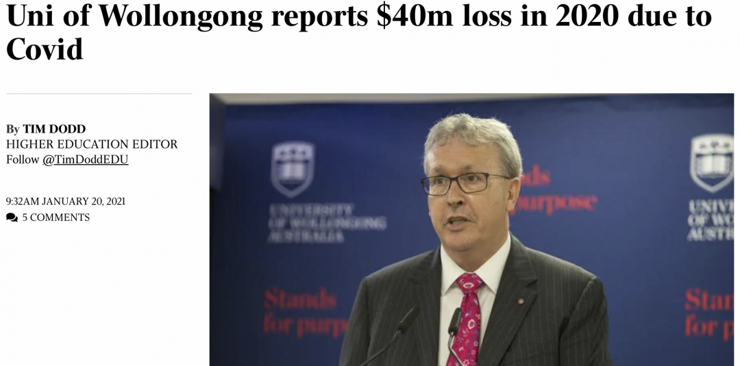 据The Australian报道,因为疫情影响,卧龙岗大学在2020年损失了$4000万澳币。