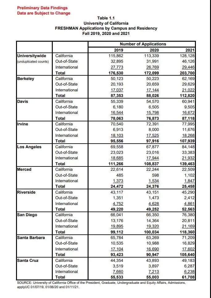 上周,加州大学系统发布了2021年Fall本科申请数据,尽管疫情影响正常的校园生活,但入学申请量却比往年激增,总申请量为249,855人,比去年增长了16.1%(包括美国学生和国际学生,不重复计数原则)。