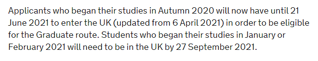 而2021年1月或2月入学的学生只需在2021年9月27日前抵达英国,则有资格申请毕业生工作签证路径。