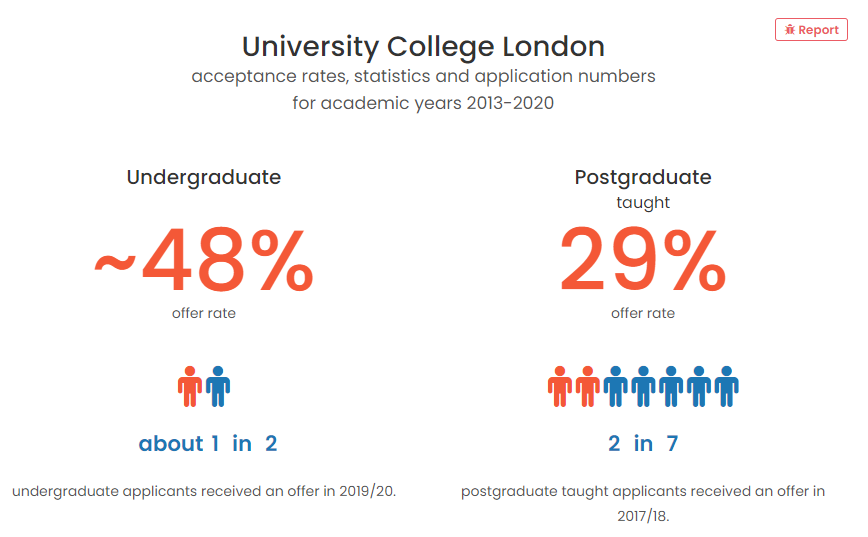 伦敦大学学院同样尚未更新2020-2021申请季的相关数据,但我们可以参考往年的一个录取数据,看一看这所英国精英大学的申请难度如何。