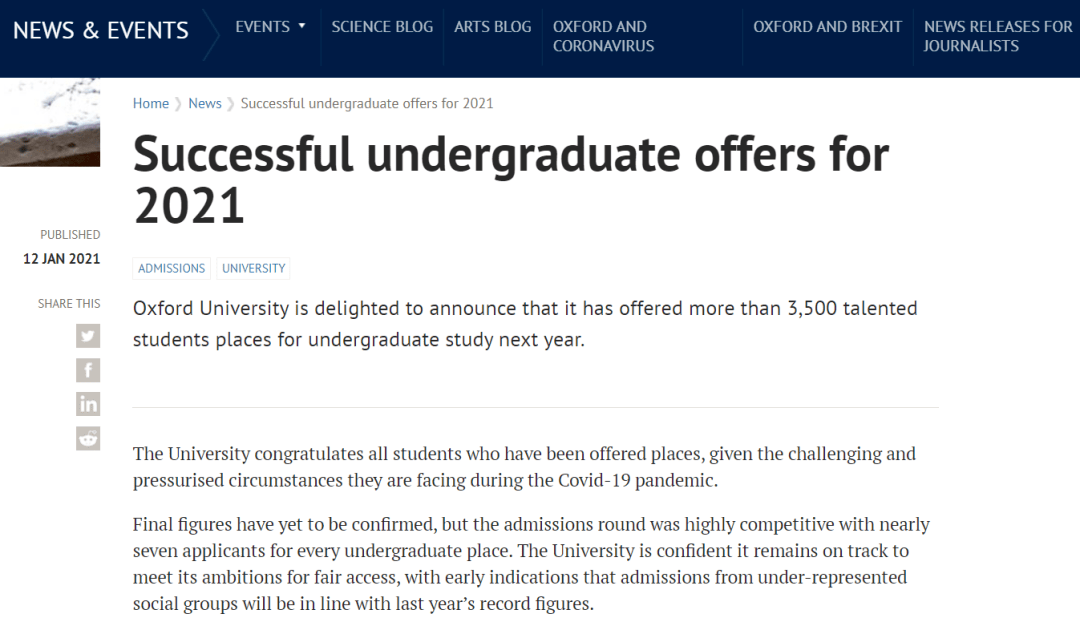 牛津大学今年申请量暴增,从2019-2020申请季的23020份申请,到2020-2021申请季的76940份申请,增加2.34倍!!
