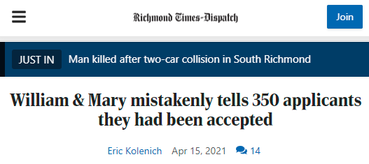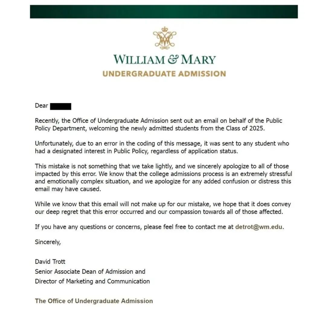 威廉玛丽学院招生高级副院长戴维·特洛特(David Trott)向受影响的学生表示:“我们对这个错误非常重视,我们对此致以深深的歉意。”