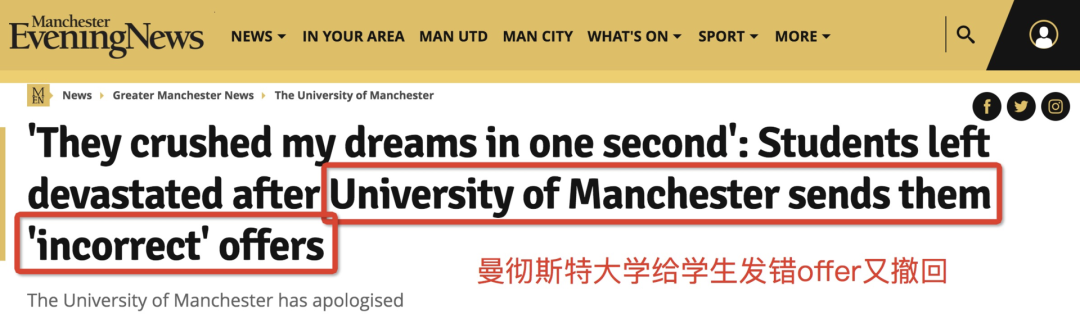 但几小时后,这些学生又收到了曼大发来的“撤回offer邮件”,说信息有误,他们还处于waitinglist里面,需要等待审核。