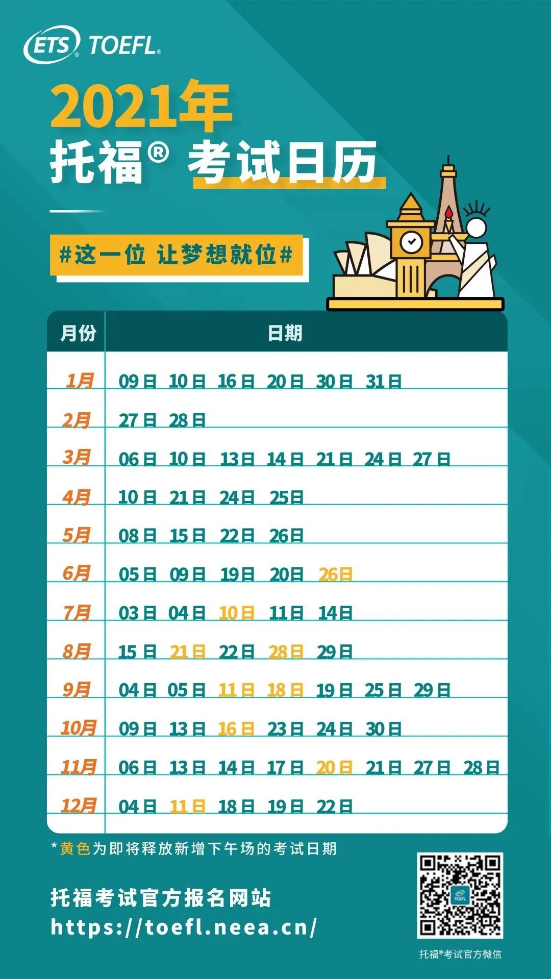 接下来,托福 iBT® 考试将在原有考试日基础上增设九个下午场考试,日期涵盖 6 月至 12 月。
