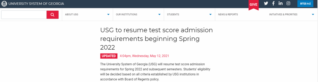 5月12日,佐治亚州大学系统宣布,2022年春季及以后学期将恢复提交标化考试的要求。意味着佐治亚大学系统旗下26所公立学校,将恢复SAT/ACT成绩作为必要申请材料。