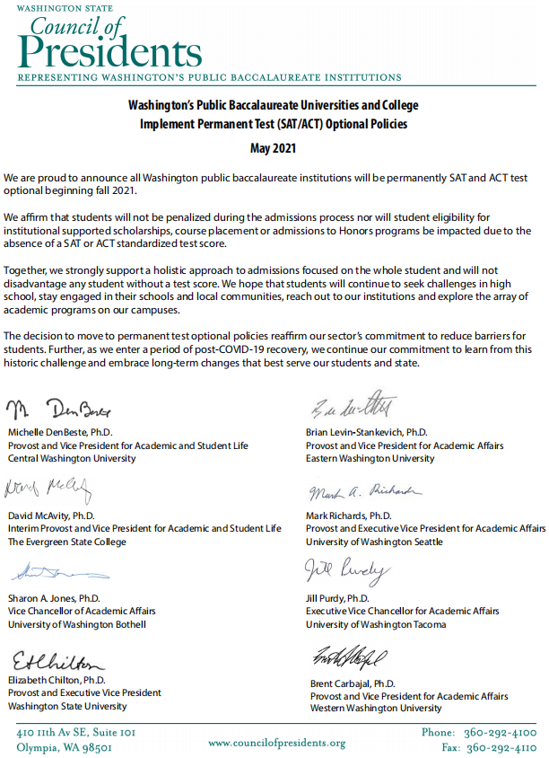 5月18日,华盛顿州正式宣布,从2021年秋季学期开始,华盛顿大学、华盛顿州立大学、中华盛顿大学、东华盛顿大学、长青州立大学和西华盛顿大学将永久实施“Test optional”政策。