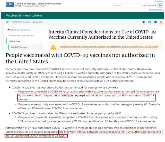 1)对于非美国授权、但得到WHO(世界卫生组织)紧急授权的疫苗,可以不必再接种美国FDA(美国食品药品监督管理局)紧急授权的疫苗(但如果是多针疫苗且没有接种完,也可以再重新接种FDA授权疫苗)。