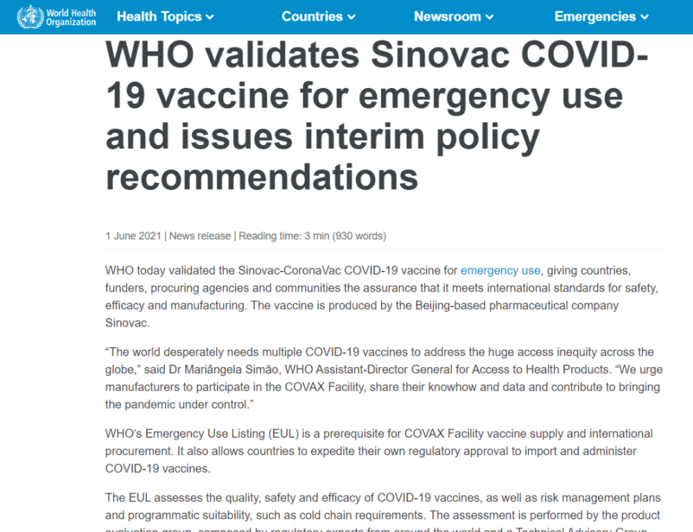 当地时间6月1日,世卫组织(WHO)宣布,北京科兴中维生物技术有限公司研制的新冠灭活疫苗通过了评审,被列入紧急使用清单,同时也是全球第七种被世卫组织纳入紧急使用清单的新冠疫苗。