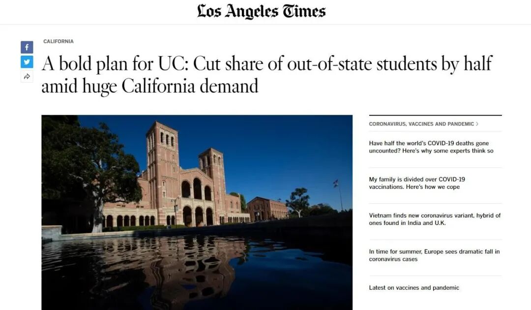 近日,据洛杉矶时报报道,加州州参议院公布了一项提案,计划从2022年开始的未来十年内,将非居民学生(国际生+美国非加州学生)入学新生的比例从目前的平均19%降至10%,并补偿UC因州外学生减少而损失的那部分州外学费。