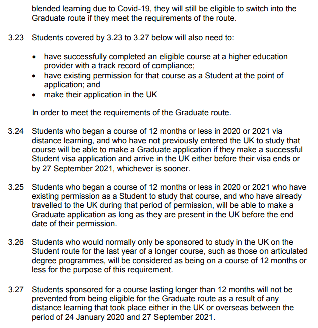 根据此前的规定,如果留学生想要申请2年毕业生工签(Graduate Route,原PSW签证),2020年秋季开学的国际学生需要在2021年6月21日前入境英国,毕业后才有资格申请。
