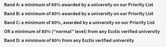 如果申请的该专业要求为Band C,满足名单中院校要求之余,要求GPA不低于80%,或者ECCTIS认证的学校,要求最低85%。