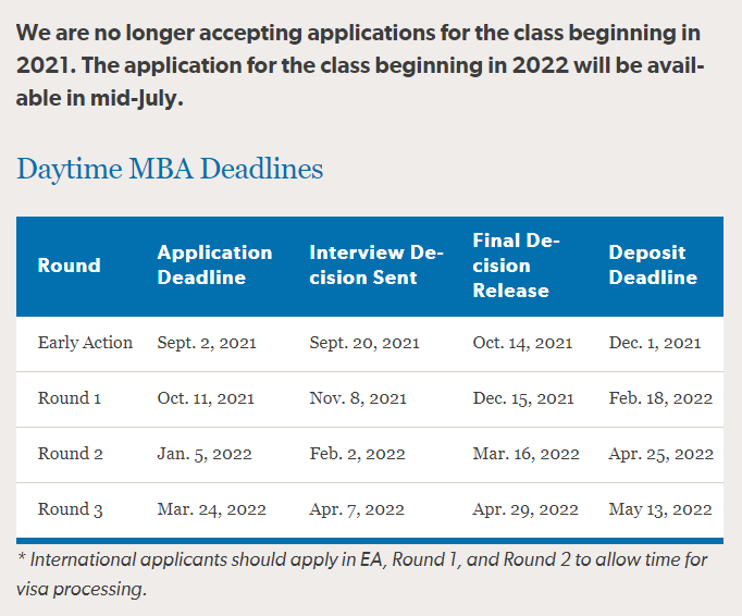 目前,部分美国商学院已经公布了MBA项目2022年入学的轮次时间安排,有一些学校第一轮截止时间是今年9月!