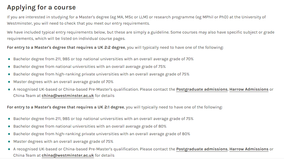 威斯敏斯特大学每个硕士项目下面同样有各国申请者入学要求的详细页面,大家选择中国,基本要求是: