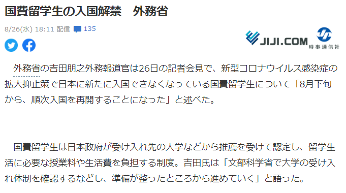 据日本媒体报道,8月26日日本外务省报道官吉田朋之在记者会上表示,对于收到疫情影响不能来到日本的国费留学生,从8月下旬开始将可以入境日本。