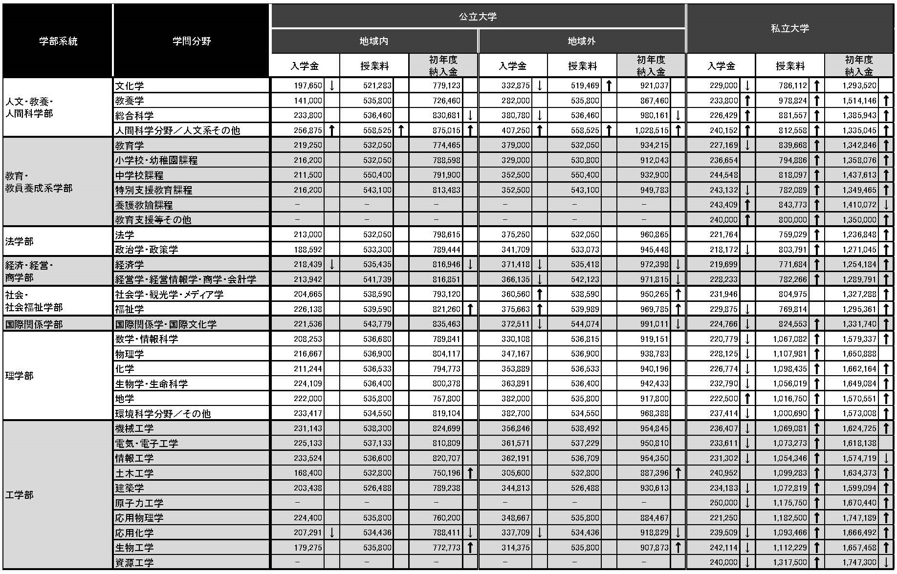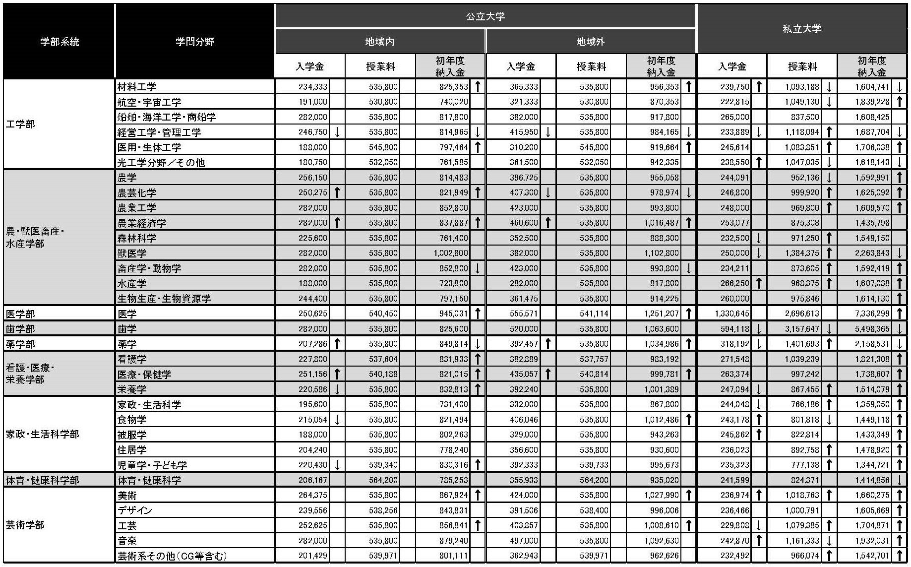 整体来说,同一学部,私立大学的入学金比公立大学便宜,但学费比公立大学贵很多,尤其是医学部、齿学部、药学部、理学部、工学部、艺术学部。