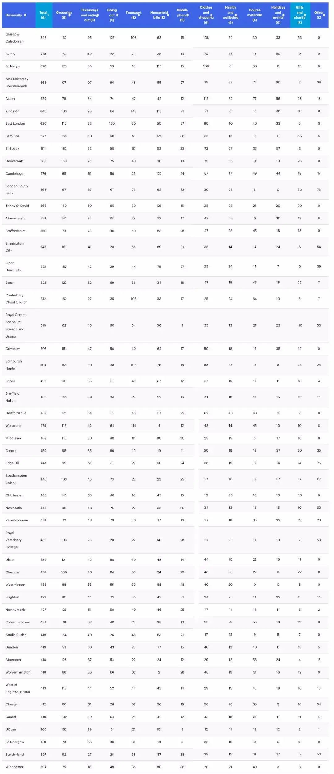 STS还统计了各个英国大学的平均生活费支出,这里的统计不包括住房租金。