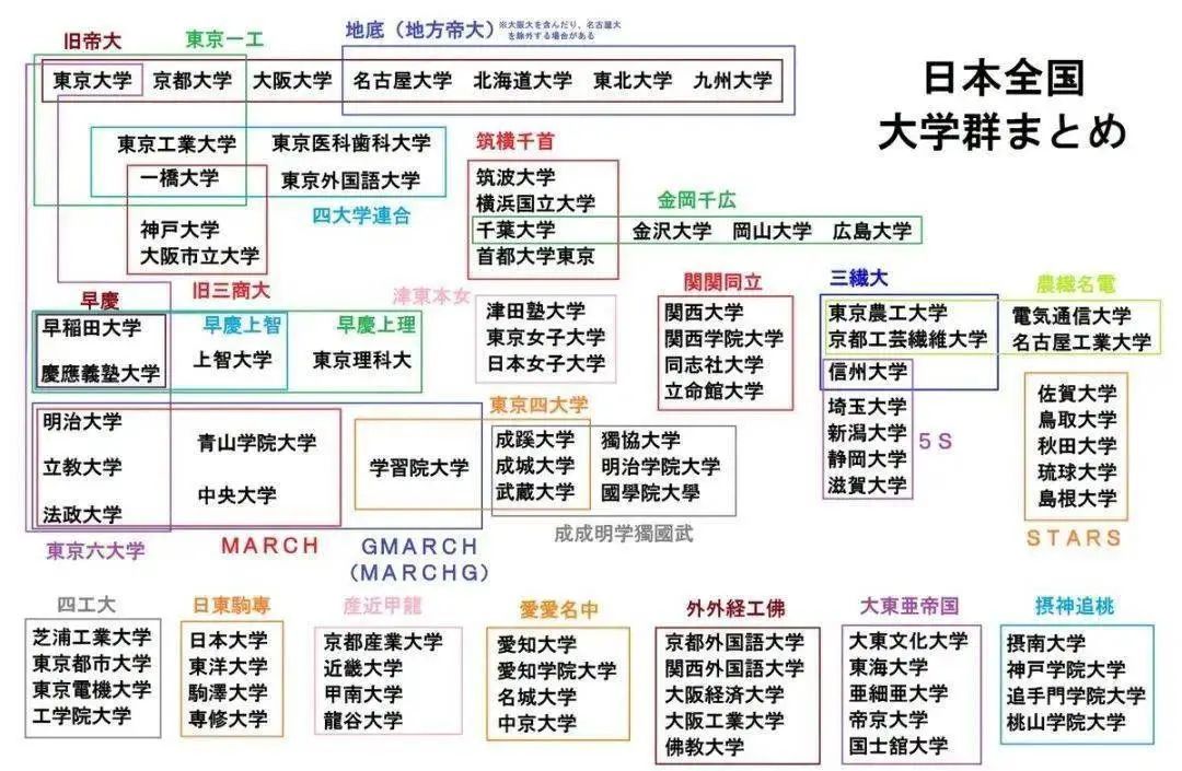 下面嘉华君就给大家科普,日本留学常见的大学分组——旧帝国大学、早庆上理、关关同立、产近甲龙、MARCH、日东专驹。