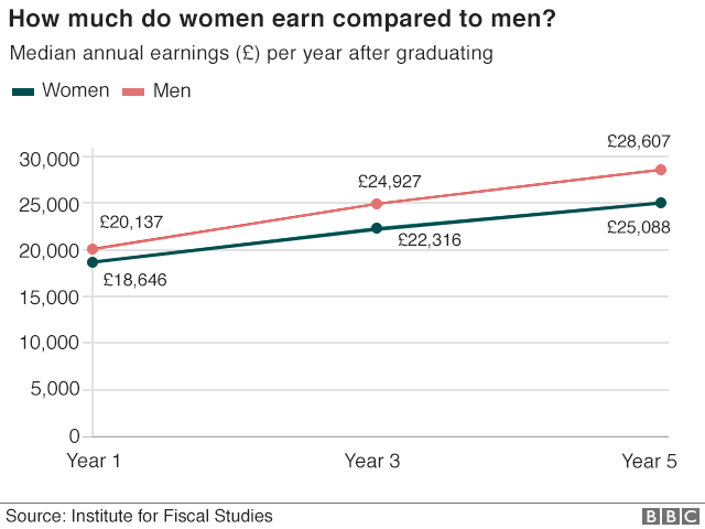 毕业后一年男性的年平均收入比女性多1,500英镑(8%)。五年之后,差距会增加到3,500英镑左右,即14%。