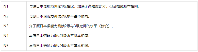 自2010年开始实施新的日本语能力测试,新JLPT的等级与原日本语能力测试的等级对应关系如下: