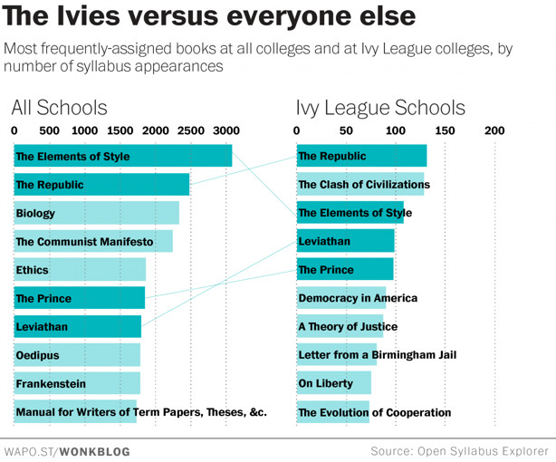 于是,《华盛顿邮报》将Open Syllabus Explorer所有美国大学要求的必读书目与7所常春藤盟校(达特茅斯学院当时未被收录)的必读书单对比,发现其中有着不小差别。