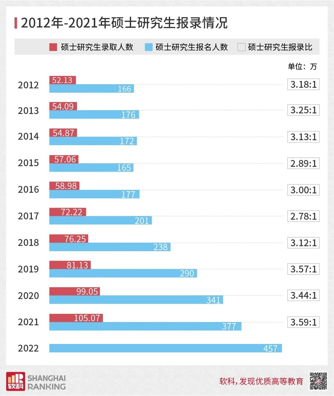 纵观近10年的硕士研究生报录比,尽管招录人数增加,但增加幅度不及报考人数,2021年就有超过200w考生落榜,按照预测,今年可能有300w考生考研失败。