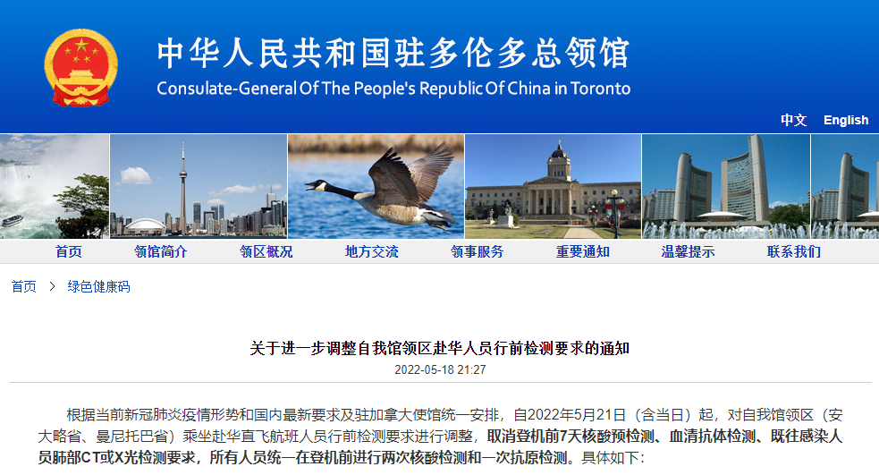 根据中国驻多伦多总领馆最新消息,自5月21日起,在加拿大安大略省、曼尼托巴省乘坐直飞航班回国,取消登机前7天核酸预检测,取消血清抗体检测,取消既往感染人员肺部CT或X光检测。