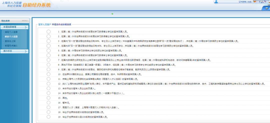 在符合留学人员落户基本条件的基础上,对于毕业于世界排名前50名院校的,取消社会保险费缴费基数和缴费时间要求,全职来本市工作后即可直接申办落户;毕业于世界排名51-100名的,全职来本市工作并缴纳社保满6个月后可申办落户。