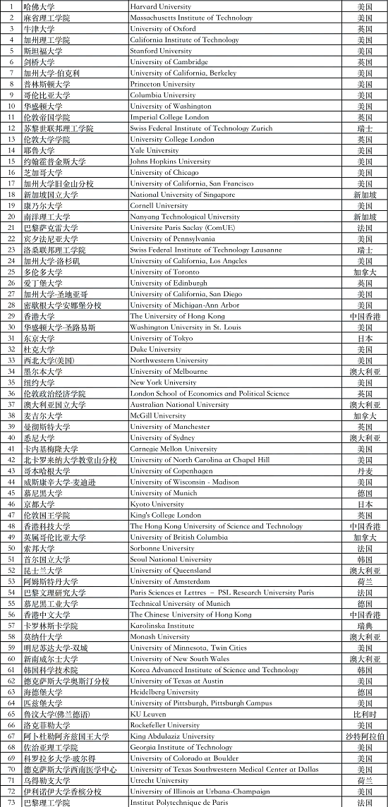 对于全球排名前50和前100大学的认定,上海人社局也有解答——由相关主管部门参照以下世界大学排名: