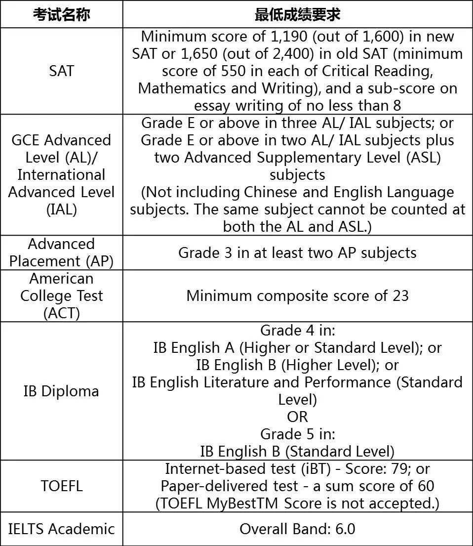 学校对考生的公开考试成绩要求,及雅思、托福或其他外语考试成绩要求,将参照香港浸会大学相关入学要求: