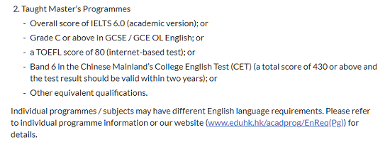 教大在硕士招生要求中明确,申请者需要持有获认可的学士学位,本科非英文授课申请者需提供英语能力证明。