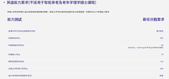 都大在硕士招生要求中明确,申请人若有意申请入读以双语或英语授课的课程,而其大学学位或同等资格并非以英语授课,则需要符合以下英语能力要求: