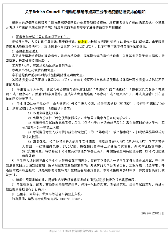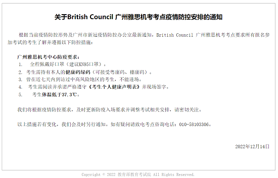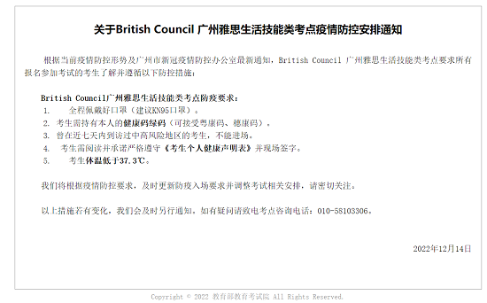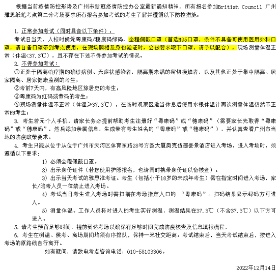 British Council广州雅思机考考点12月新增雅思和用于英国签证及移民的雅思机考共计9场,现已开放报名。2023年1月至2月新增雅思和用于英国签证及移民的雅思机考共计63场,即将开放报名。