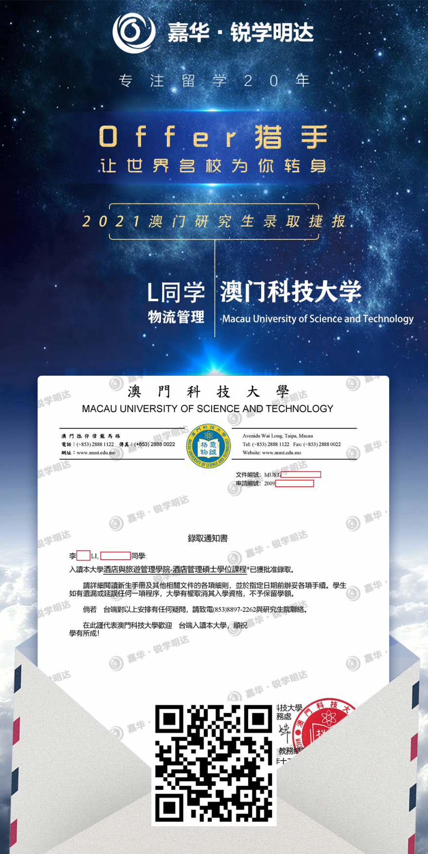 学生申请时间也是非常紧凑,11月7日和嘉华签约留学服务,11月9日就要递交申请,1个月时间就收到澳门科技大学酒店管理硕士录取offer!