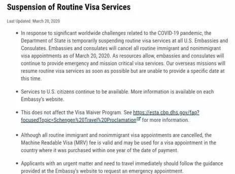 另外,美国国务院发布通知,为了应对COVID-19在全球范围内蔓延的重大危机,暂时终止了所有美国大使馆的领事馆的常规签证服务。