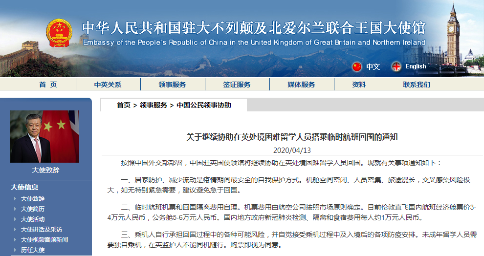 4月13日,中国驻英国使领馆发布信息称,使馆将继续协助在英处境困难留学人员回国,并发布了最新的《关于继续协助在英处境困难留学人员搭乘临时航班回国的通知》。