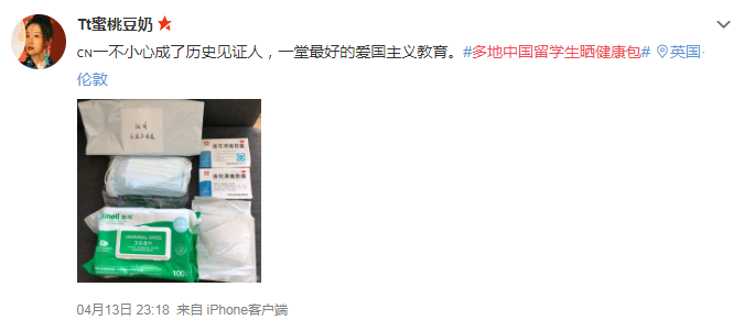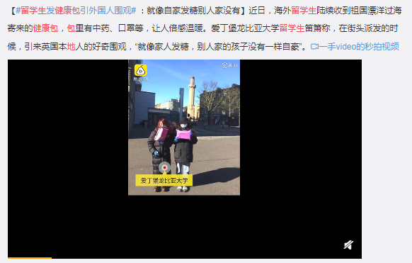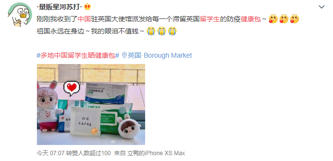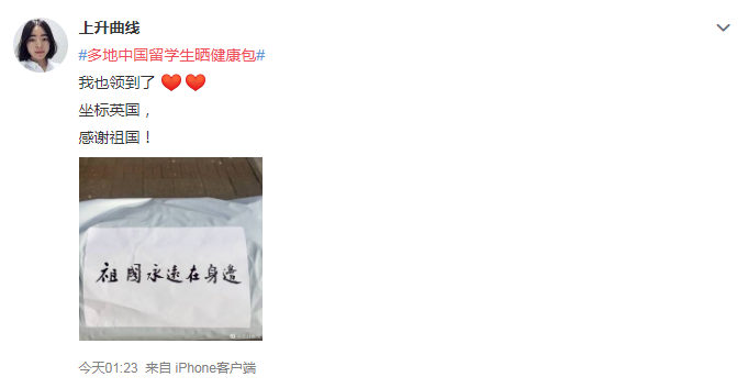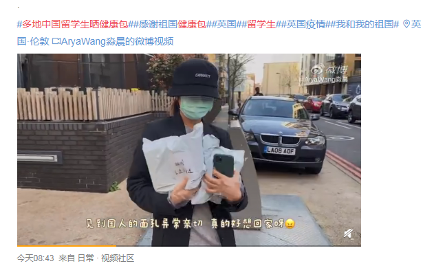 选择待在英国的中国留学生们也陆续收到祖国漂洋过海寄来的健康包,包里有中药、口罩等,让人倍感温暖。