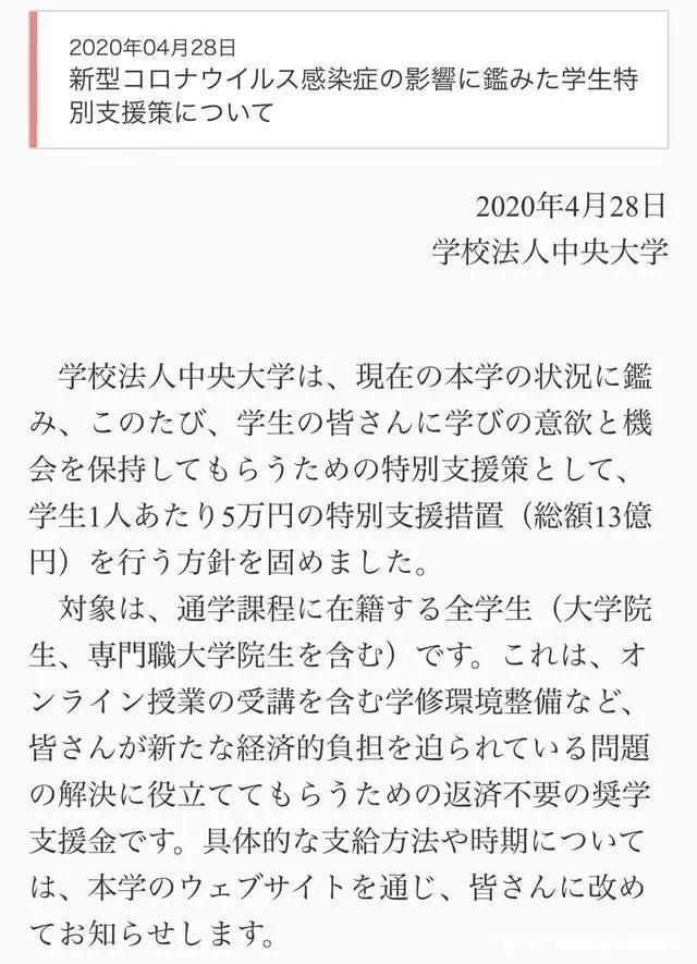 4月28日,中央大学是一所日本的著名私立综合大学,疫情的发生,为了给学生提供良好的学习,给在校生每人发5万日元补贴!